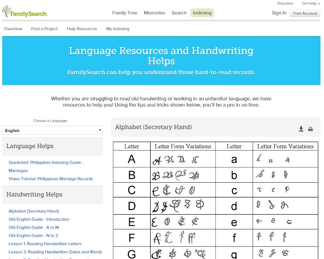 The Language Helps were not useful for me since they are focusing on the Philippines. What I did find very useful are the Handwriting helps. The Alphabet Secretary Hand is very useful and you are allowed to either download the image into your computer or print to have as an easy reference guide while researching on libraries or archives.